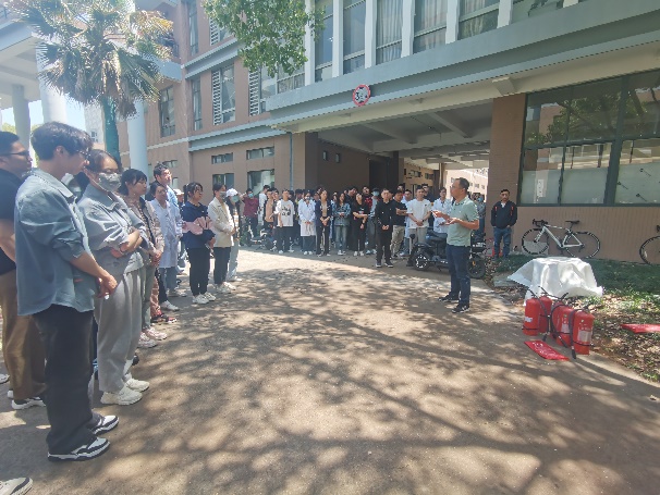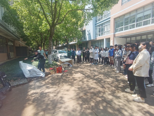 逃生演练结束后,保卫处消防科吴挺老师对学生进行了灭火器、灭火毯实操培训,并现场演示了灭火器和灭火毯的使用,在场的学生们在学习与演练的过程中进一步加深了对消防器材使用方法的理解与认识,并掌握了灭火器和灭火毯的使用技能。