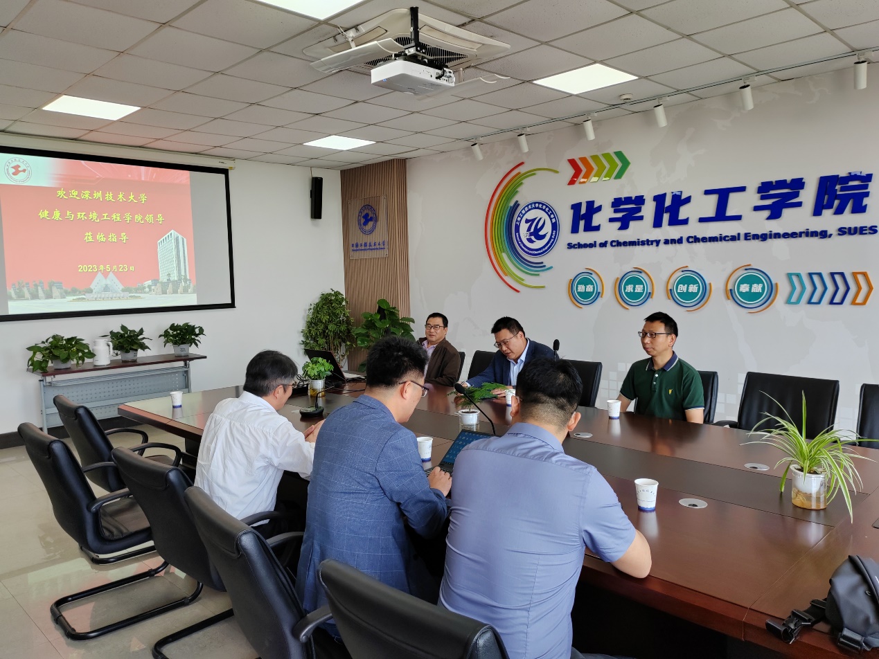 5月23日,深圳技术大学健康与环境工程学院院长胡俊青教授一行三人访问化学化工学院。化学化工学院院长王金果,副院长陆杰,学院教师刘锡建、孙彦刚等参加座谈交流。双方就学院的学科建设、课程建设、项目合作等方面进行了广泛而深入的交流。
