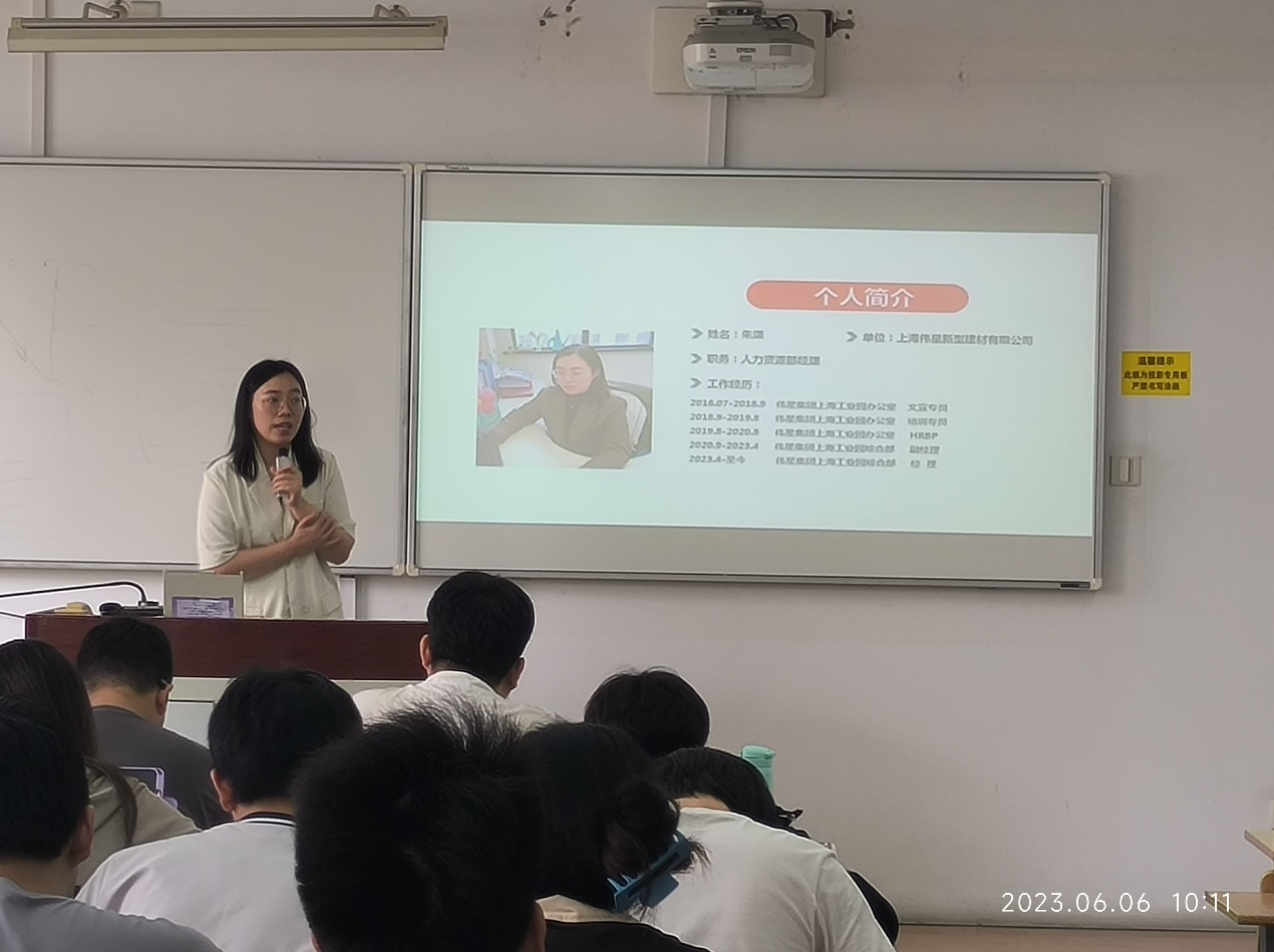 6月6日,上海伟星新型建材有限公司在教学楼A302开展校园招聘宣讲会,伟星集团上海工业园综合部经理朱潇来校为高分子、涂料专业学生开展招聘宣讲会,化学化工学院团委书记郑文静老师主持。