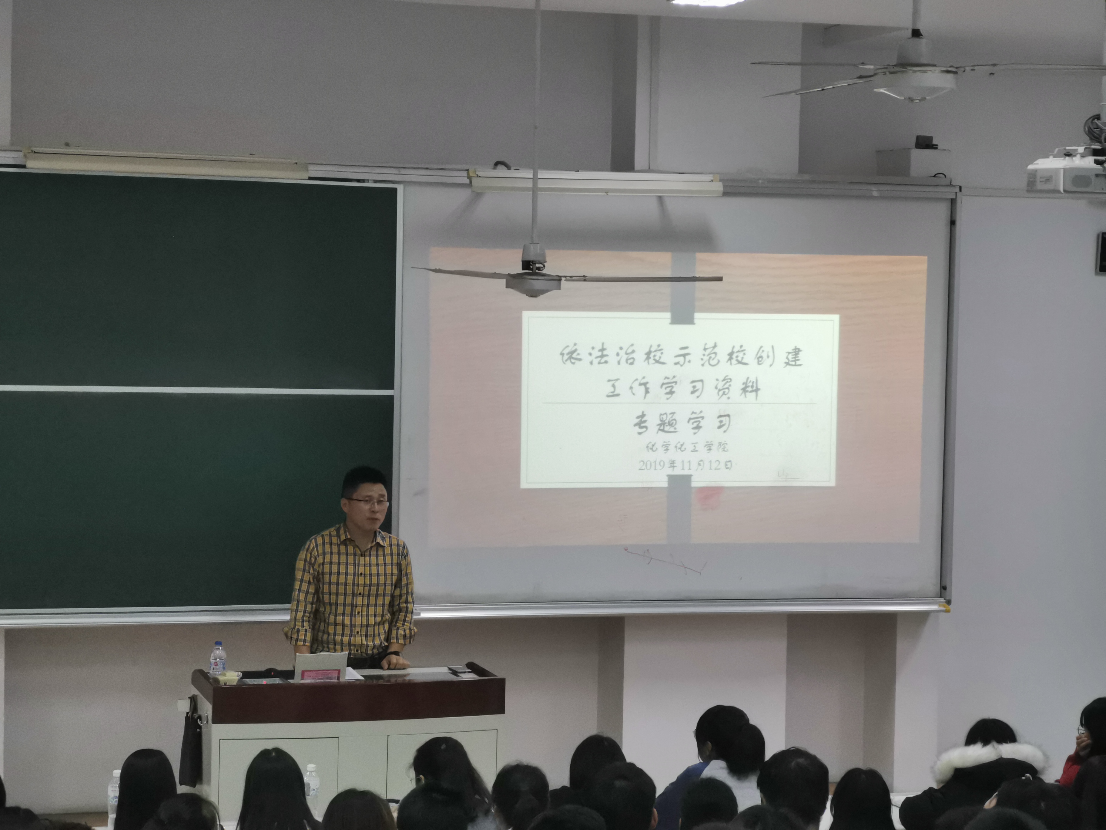 为深入学习党的关于全面推进依法治国精神,贯彻教育部《全面推进依法治校实施纲要》,落实上海市教育法治建设“十三五”规划总体要求和学校依法治校示范校创建工作的总体部署,11月12日下午,化学化工学院召开了依法治校创建工作学习材料专题学习,专题学习由学生工作办公室辅导员张晓普主持,137名学生参加了学习会。