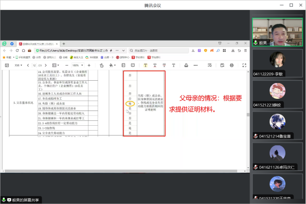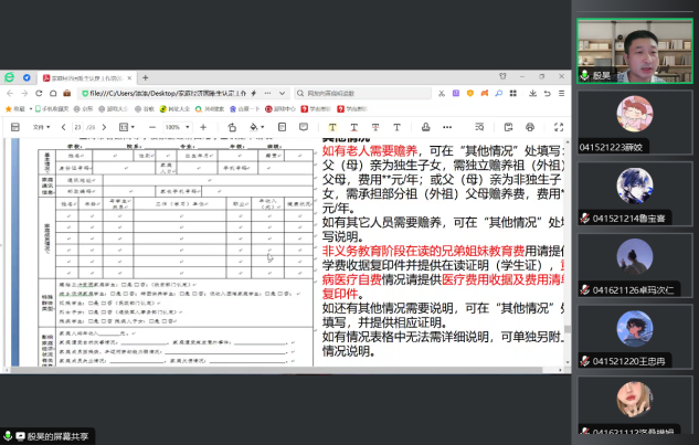 殷昊老师向学生们介绍了国家资助政策和学校帮扶政策,就困难生申请所需准备的材料和系统中申请表格填写注意事项等分类讲解,从学生家庭经济情况、民主评议情况以及学院综合评价三个方面为学生详细解释了内容和要求,并仔细说明了线上填写学生家庭经济情况表问题的细节、填写要求以及所需的具体材料,并就学生所提出的问题进行解释和答疑。