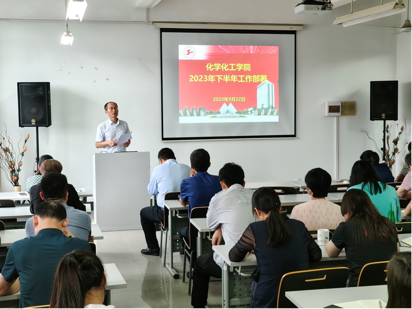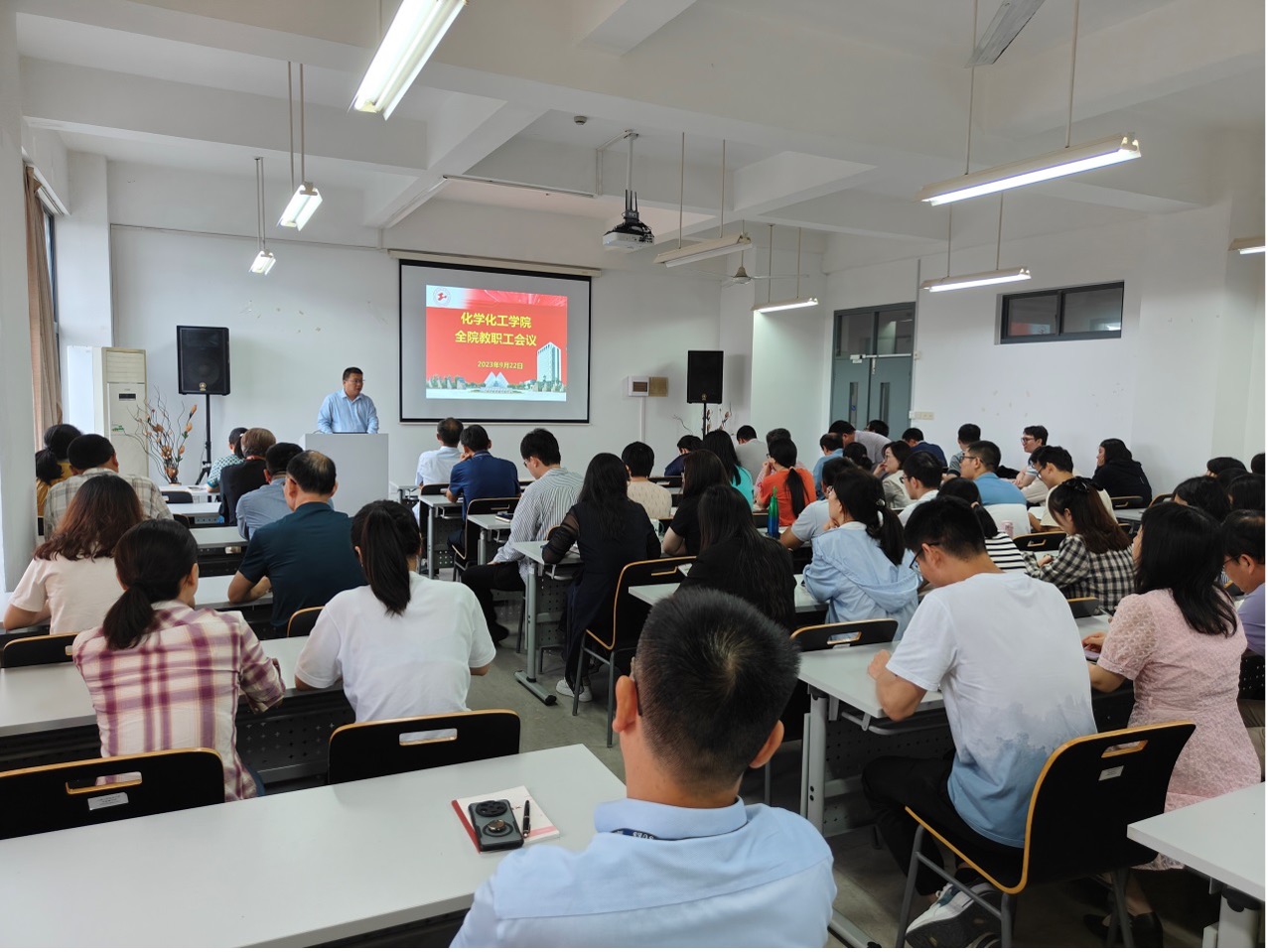 为进一步团结全院教职工,凝心聚力发展学院各项工作,9月22日上午,化学化工学院在实训楼4418会议室召开新学期教职工大会暨下半年工作部署会议。学院党政领导班子出席,学院全体教职工参加了会议。学院党委副书记、院长王金果主持会议。