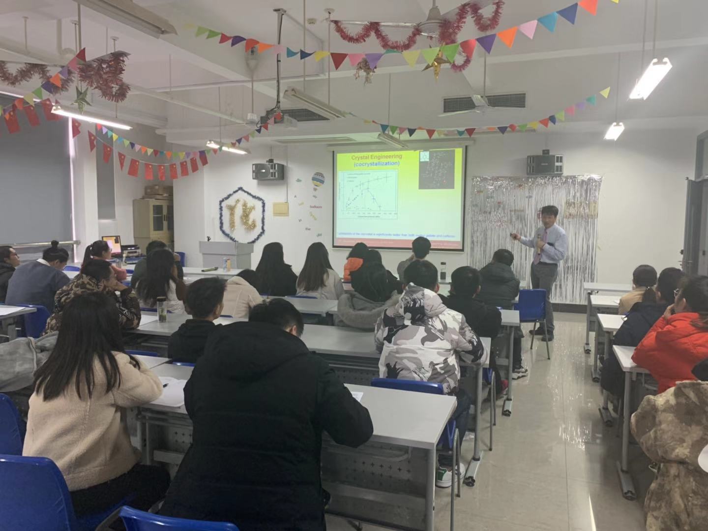 20191223日下午,美国明尼苏达大学Changquan Calvin Sun教授应我校化学化工学院邀请,在实训楼4号楼4405室,以“联合晶体和颗粒工程在快速片剂开发中的应用”为题,给化学化工学院师生做学术报告。本次学术报告由化学化工学院院长饶品华教授主持,优秀青年教师,研究生等参与本次学术研讨活动。Changquan Calvin Sun教授在报告中主要介绍了联合晶体和颗粒工程在快速片剂开发中的应用。介绍了片剂配方的复杂性,原料药的材料学性能(结构、性质、性能)和制剂工艺四者如何相互作用,相互影响;药物晶体工程的共晶技术、成盐技术和颗粒工程的颗粒流动性等对片剂可压性的影响;最后列举了二甲双胍和阿魏酸两个生动的应用实例。报告会后,孙教授与学院的师生进行积极的互动交流,并针对师生提出的问题,进行了详细的解答。