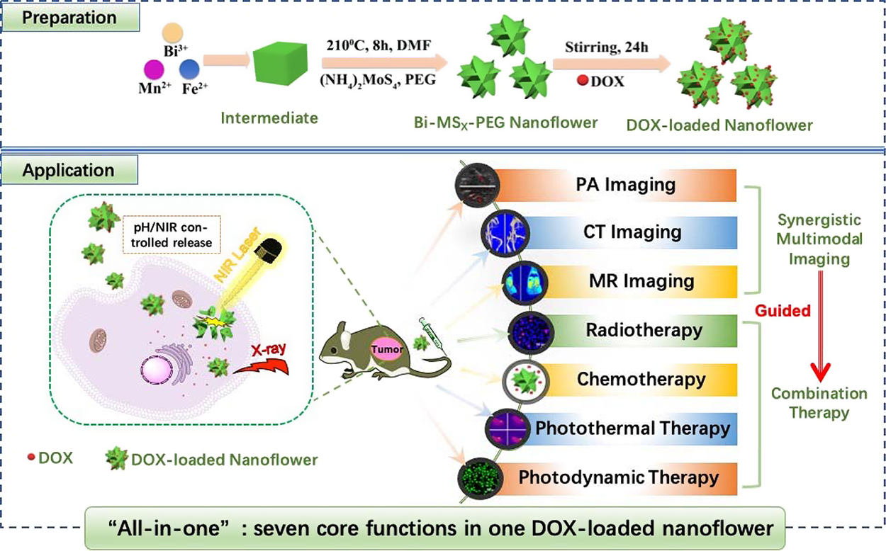 癌症是一种威胁人类健康的严重疾病,但目前在癌症诊疗方面没有特别有效的方法。在癌症诊断,尤其是癌症的早期诊断尚需进一步加强,现在有癌症治疗方法也存在毒副作用大。面对以上难题,我校化学化工学院刘锡建副教授和陆杰教授指导研究生任兰芳开发了一种铋掺杂的硫化物纳米花,可以实现CT、核磁、光声三重成像诊断,和化疗、光热治疗、光动力治疗、放疗四重治疗,可以达到全面的肿瘤诊断和完全清除肿瘤。该研究得到上海市第一人民医院的技术和实验支持,得到了国家自然科学基金的资助。