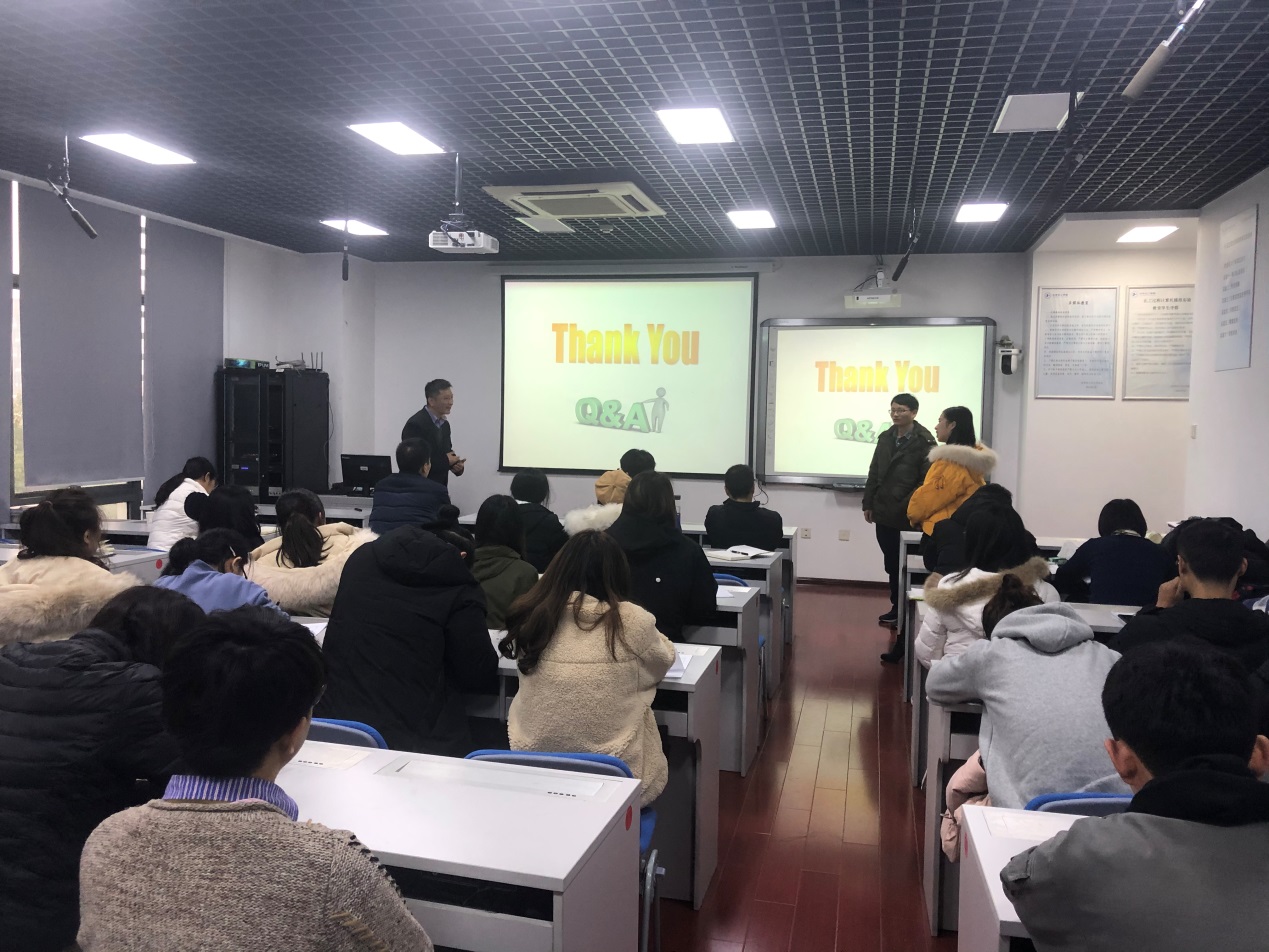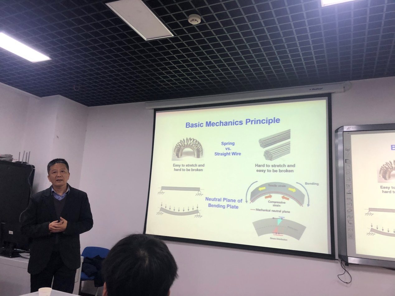 Liu Zhuangjian教授介绍了其可穿戴设备的计算力学方面的工作,柔性可穿戴传感器在人类生命健康个性化监测、智能机器人方面有非常迫切的需求和广阔的应用前景,目前也是材料学、化学、信息学等交叉学科的研究热点。针对目前柔性传感器在设计方面存在的问题,Liu Zhuangjian教授课题组提出用器件结构设计出发,通过模拟预测和判断器件的力学分布,设计和优化器件的形状和结构,从而实现器件能够具有稳定可靠的性能。Liu Zhuangjian教授的报告内容丰富、生动活泼、深入浅出,将高深的科学问题讲的通俗易懂,与会师生深受启发,开阔了眼界。会后,与会师生向Liu Zhuangjian教授请教了一些相关问题,进行了愉快、深入的互动交流,师生们受益匪浅,反响热烈。