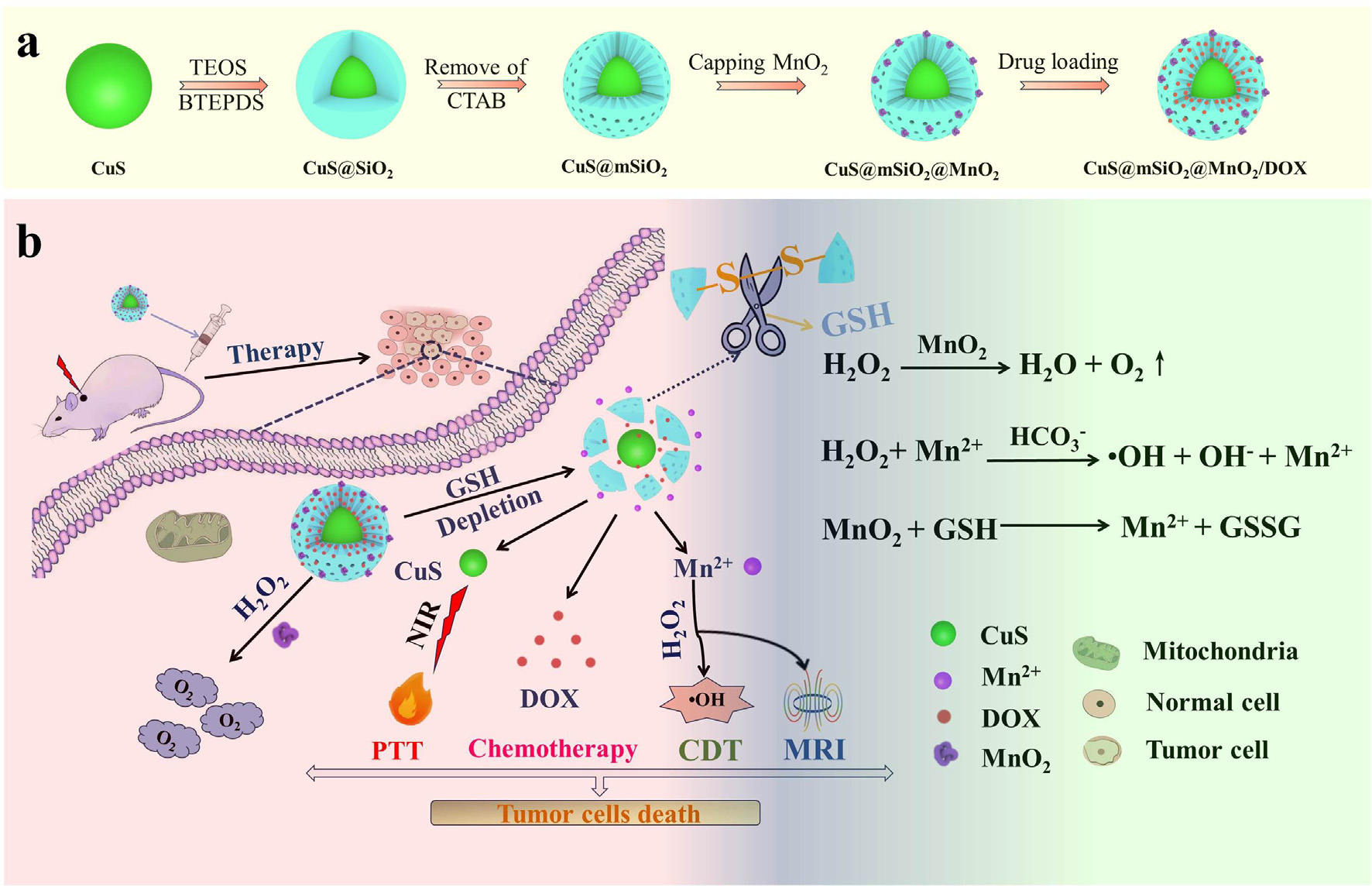 癌症是一种威胁人类健康的严重疾病,但目前在癌症诊疗方面没有特别有效的方法。面对以上难题,我校化学化工学院刘锡建副教授和陆杰教授指导研究生张旻昳开发了一种可降解的智能纳米诊疗试剂,该智能纳米试剂负载抗癌药物通过EPR效应聚集在肿瘤区域,由于肿瘤区域高浓度的谷胱甘肽、弱酸性和存在少量H2O2等特性,纳米试剂可在肿瘤区域响应降解,释放化疗药物,纳米试剂表面的MnO2与谷胱甘肽反应生成Mn2+可以作为核磁成像试剂引导治疗,同时MnO2与H2O2反应可生成氧气,缓解肿瘤乏氧情况提高化疗效果,生成Mn2+又可以催化H2O2分解生成羟基自由基进行化学动力学治疗,另外近红外激光照射可以驱动光热治疗,从而实现核磁成像引导下的化疗/化学动力学治疗/光热治疗协同增强治疗效果,能够完全清除肿瘤。该项研究得到上海市第一人民医院的技术和实验支持,得到了国家自然科学基金(21978165, 31701032)的资助。