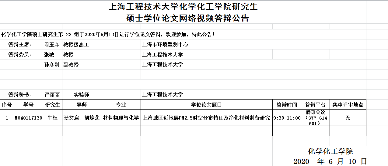 上海工程技术大学化工学院研究生硕士学位论文网络视频答辩公告-6月13日第22组