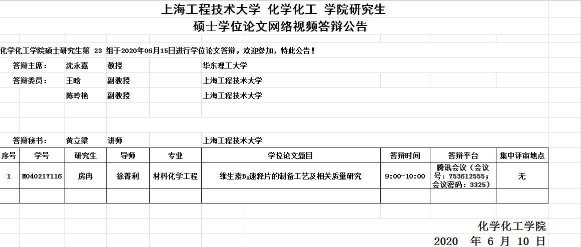 上海工程技术大学化工学院研究生硕士学位论文网络视频答辩公告-6月15日第23组