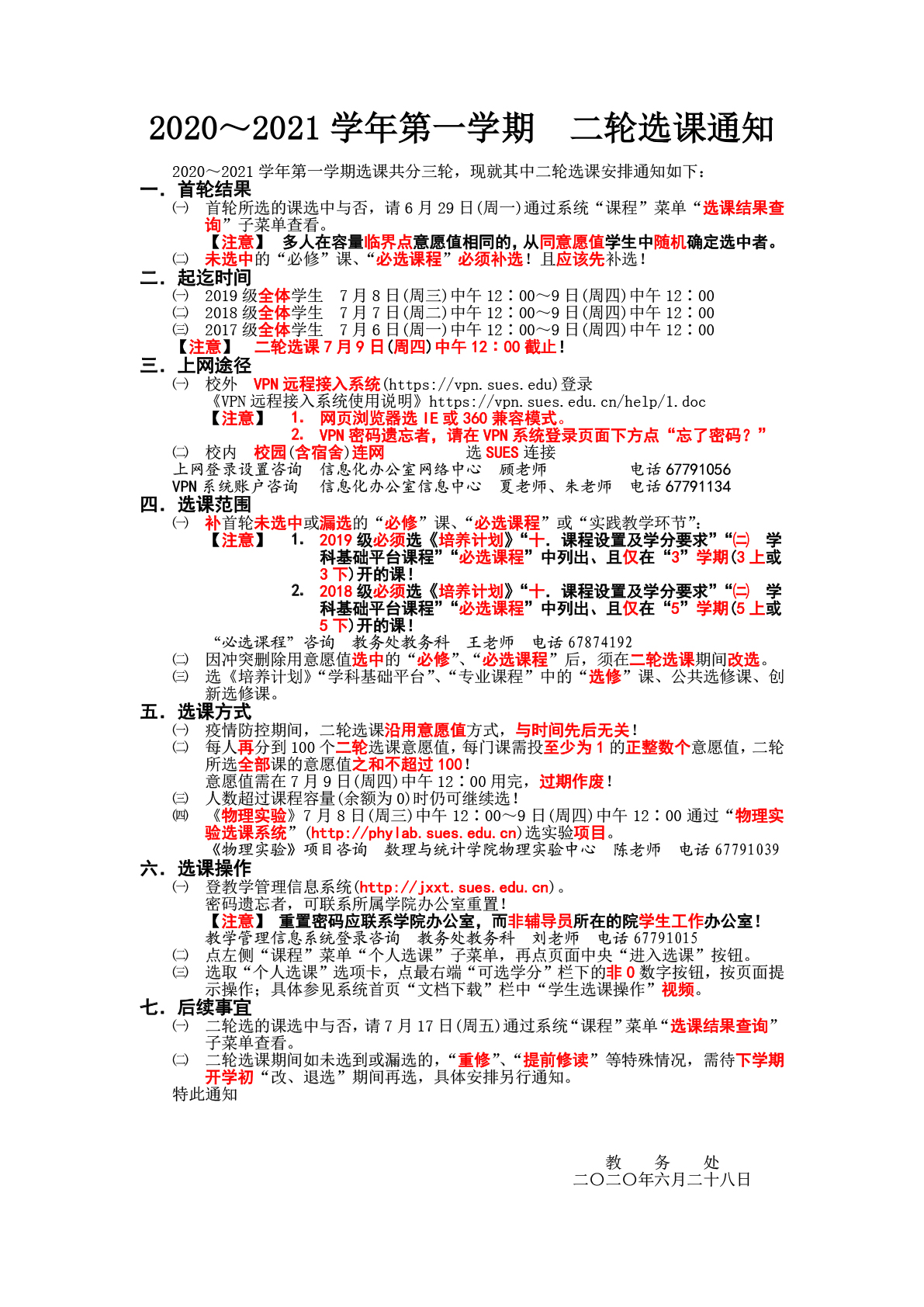 2020~2021学年第一学期 二轮选课通知