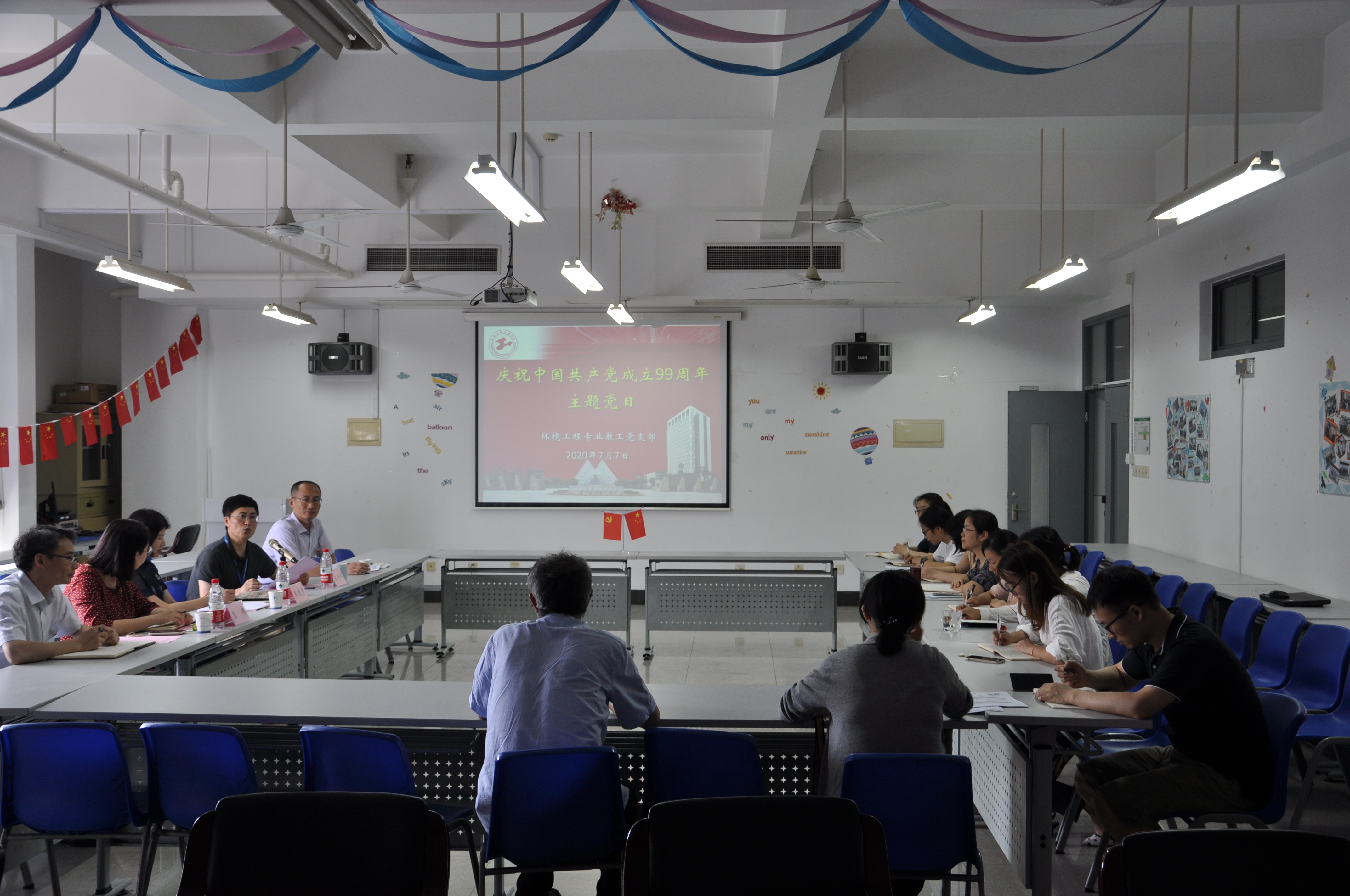 化学化工学院党委环境工程专业教工党支部于2020年7月7日中午12:30在实训楼4405开展了庆祝中国共产党成立99周年主题党日。会议由支部书记胡婷莛同志主持,校党委副书记、副校长朱晓青,党委组织员熊伟,学院党委书记宋勤健,学院党委副书记、院长饶品华,李光辉教授和支部全体党员同志参加。