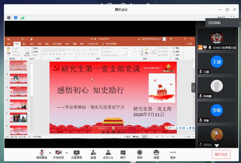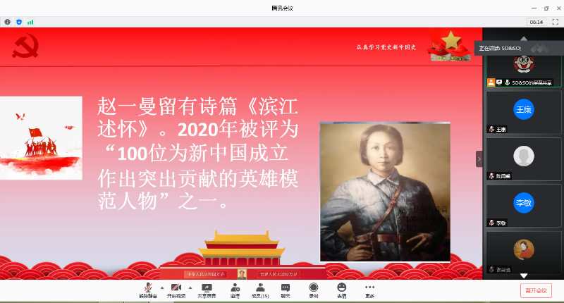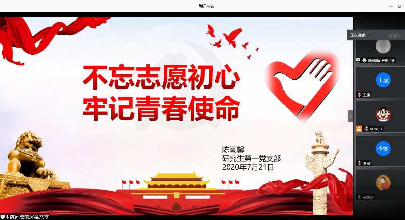 化学化工学院研究生第一党支部于7月21日下午通过腾讯会议平台开展了“四史”学习教育特色微党课——“感悟初心,知史励行”和先锋党课——“不忘志愿初心,牢记青春使命”。会议由支部书记李晓春主持,全体支部党员参加,王金果副院长观摩了本次党课学习。