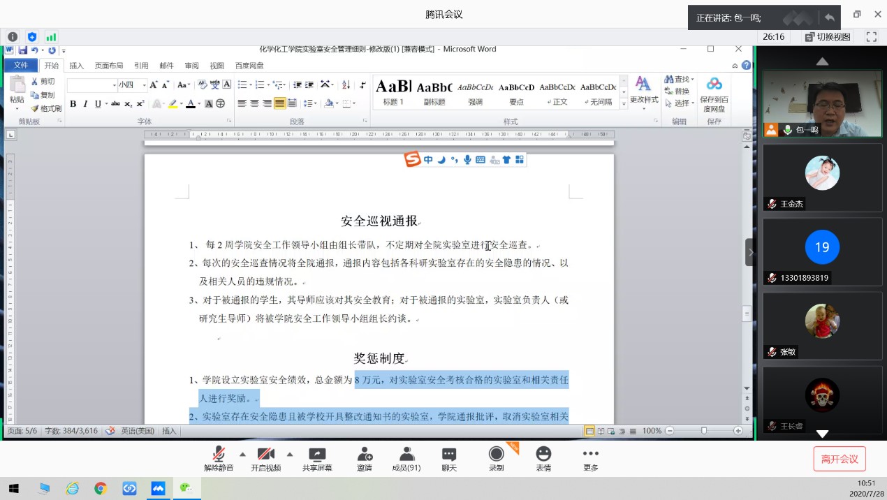 7月28日上午,化学化工学院通过腾讯会议召开了2020实验室安全检查培训线上会议,会议由副院长王金果主持,化学化工学院全体教职工及返校研究生参加了会议。