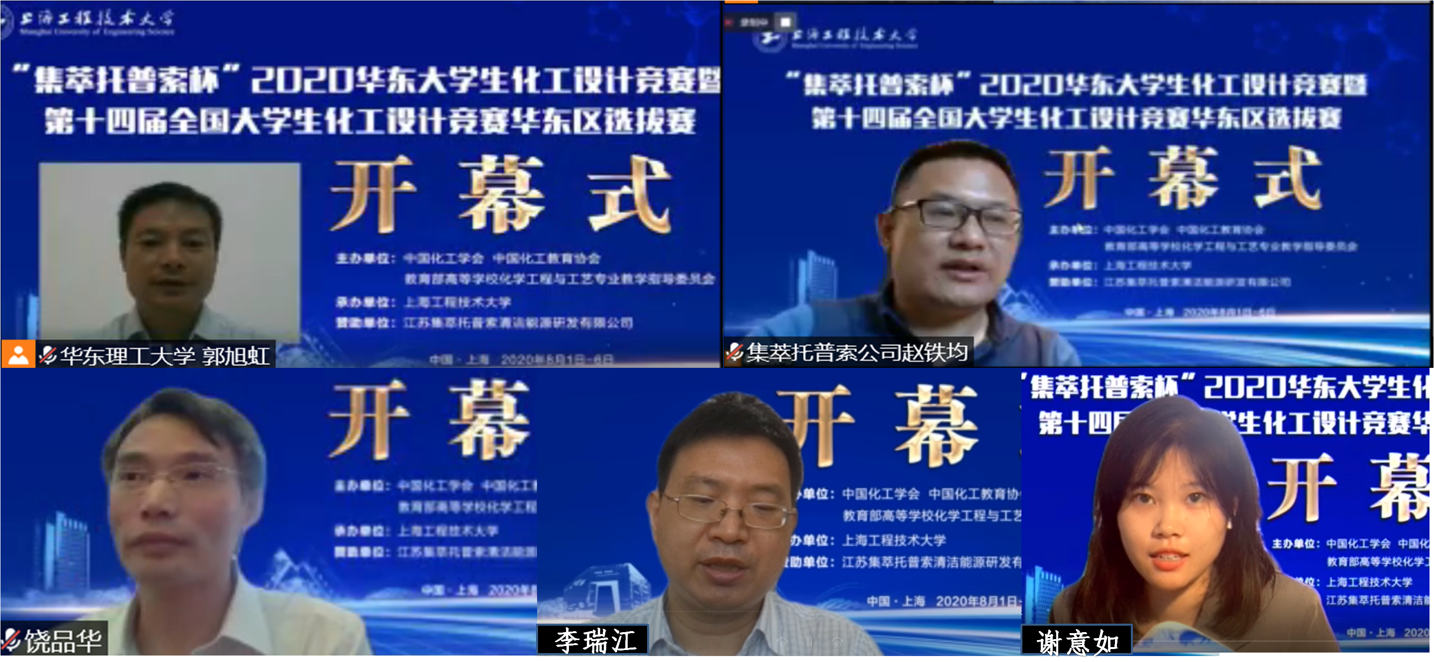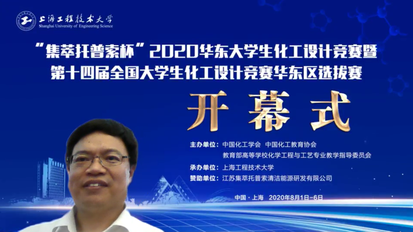 2020年8月3日,“集萃托普索杯”2020华东大学生化工设计竞赛暨第十四届全国大学生化工设计竞赛华东选拔赛在我校松江校区隆重开幕。上海工程技术大学夏春明副校长、华东赛区竞赛委员会主任华东理工大学化工学院副院长郭旭虹教授、江苏集萃托普索清洁能源研发有限公司赵铁均总经理出席并分别致辞,上海工程技术大学化学化工学院院长饶品华教授主持竞赛开幕式。